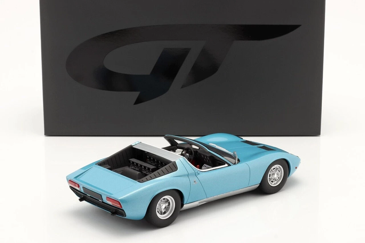 - Brand new 1/18 scale car model of 1968 Lamborghini Miura Roadster Light Blue Metallic Limited Edition to 999 pieces Worldwide model car by GT Spirit.