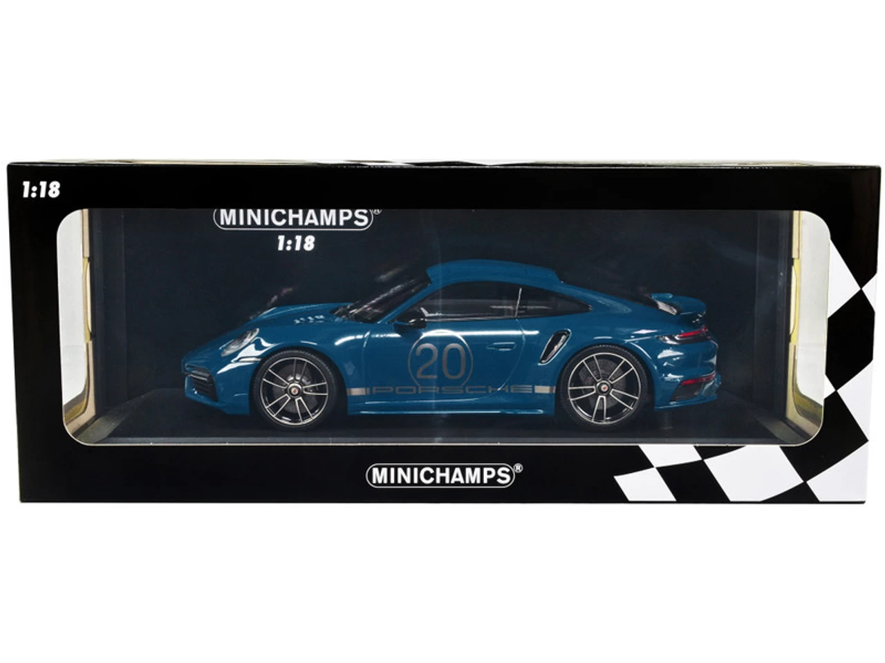 - Brand new 1/18 scale diecast car model of 2021 Porsche 911 Turbo S with SportDesign Package #20 Blue Metallic with Silver Stripes Limited Edition to 504 pieces Worldwide die cast model car by Minichamps.
