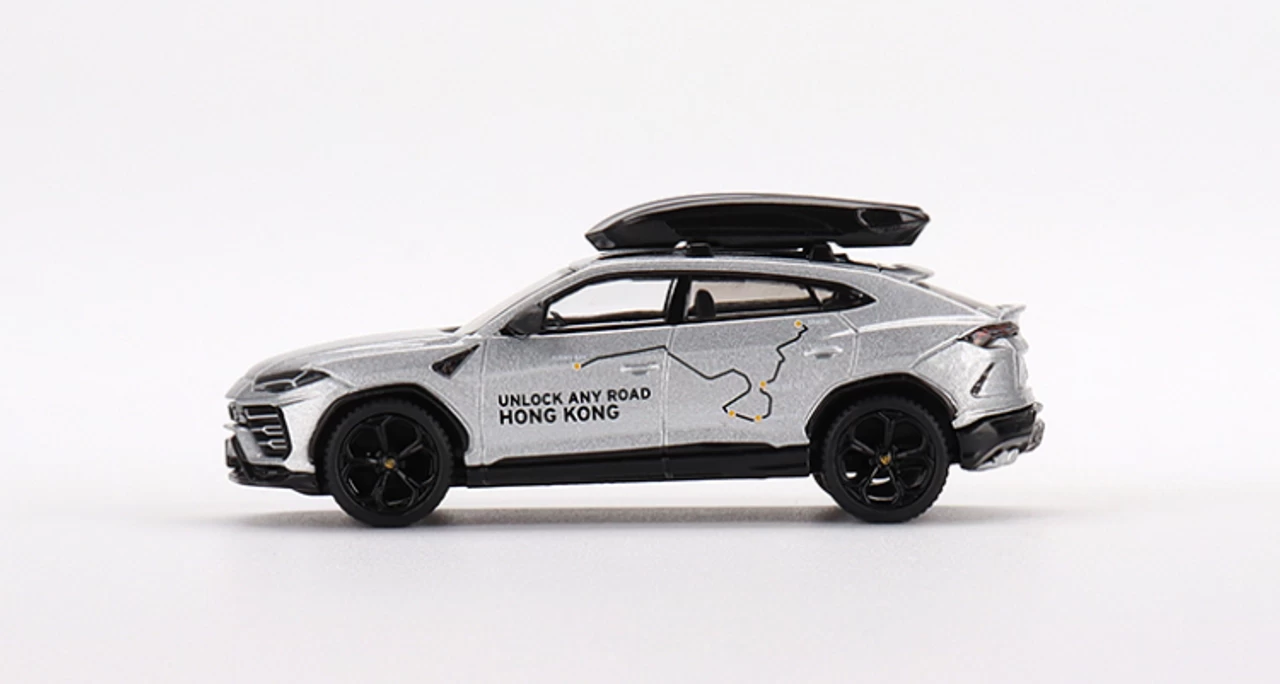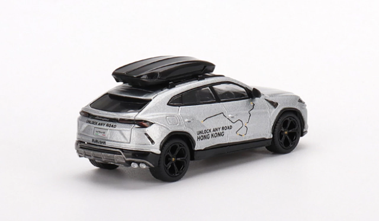 - Brand new 1/64 scale diecast car model of Lamborghini Urus with Roof Box “Unlock Any Road Hong Kong” Silver Metallic Limited Edition die cast model car by True Scale Miniatures.