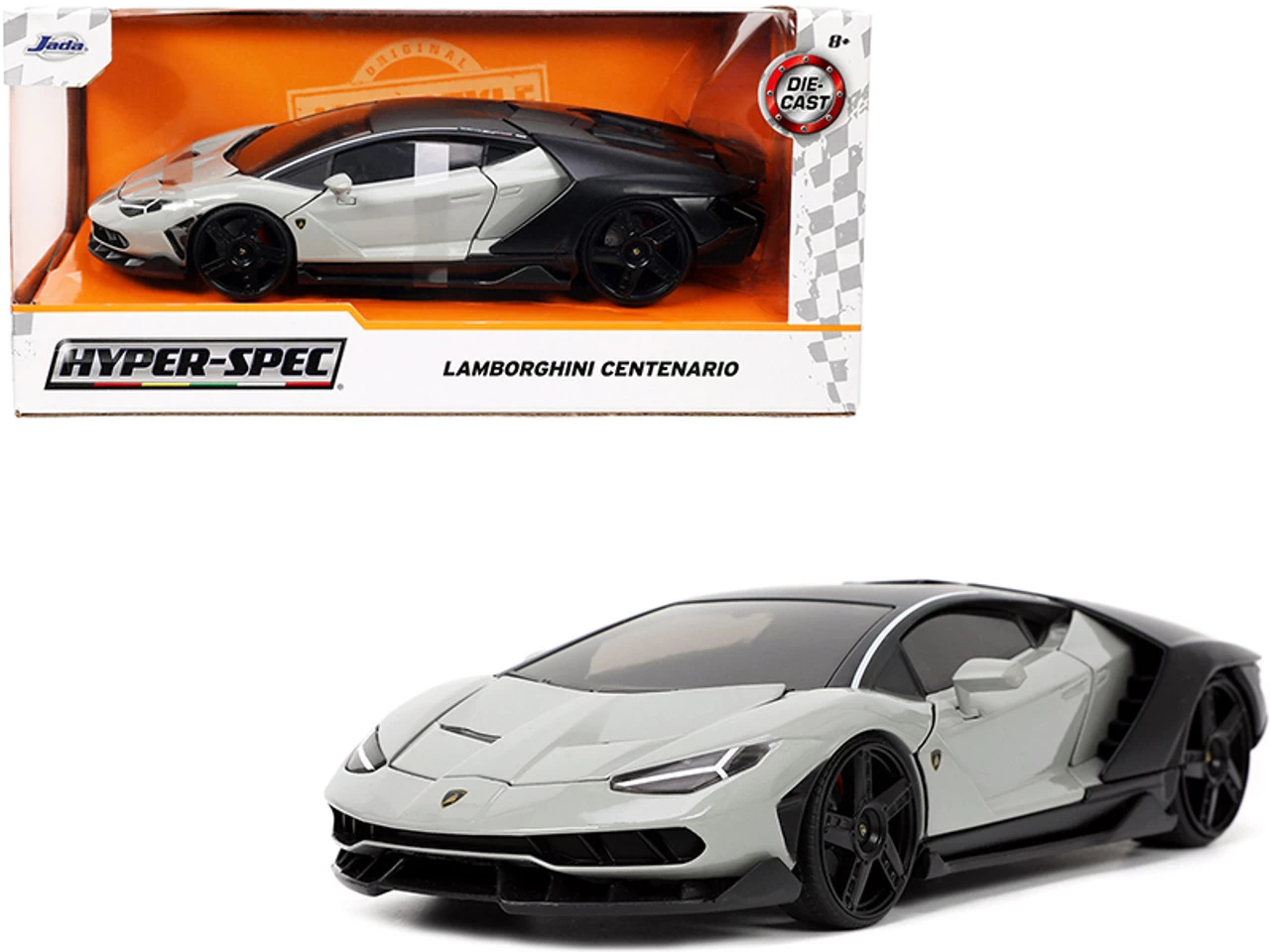 - Brand new 1/24 scale diecast car model of Lamborghini Centenario Gray and Matt Black “Hyper-Spec” Series die cast model car by Jada.