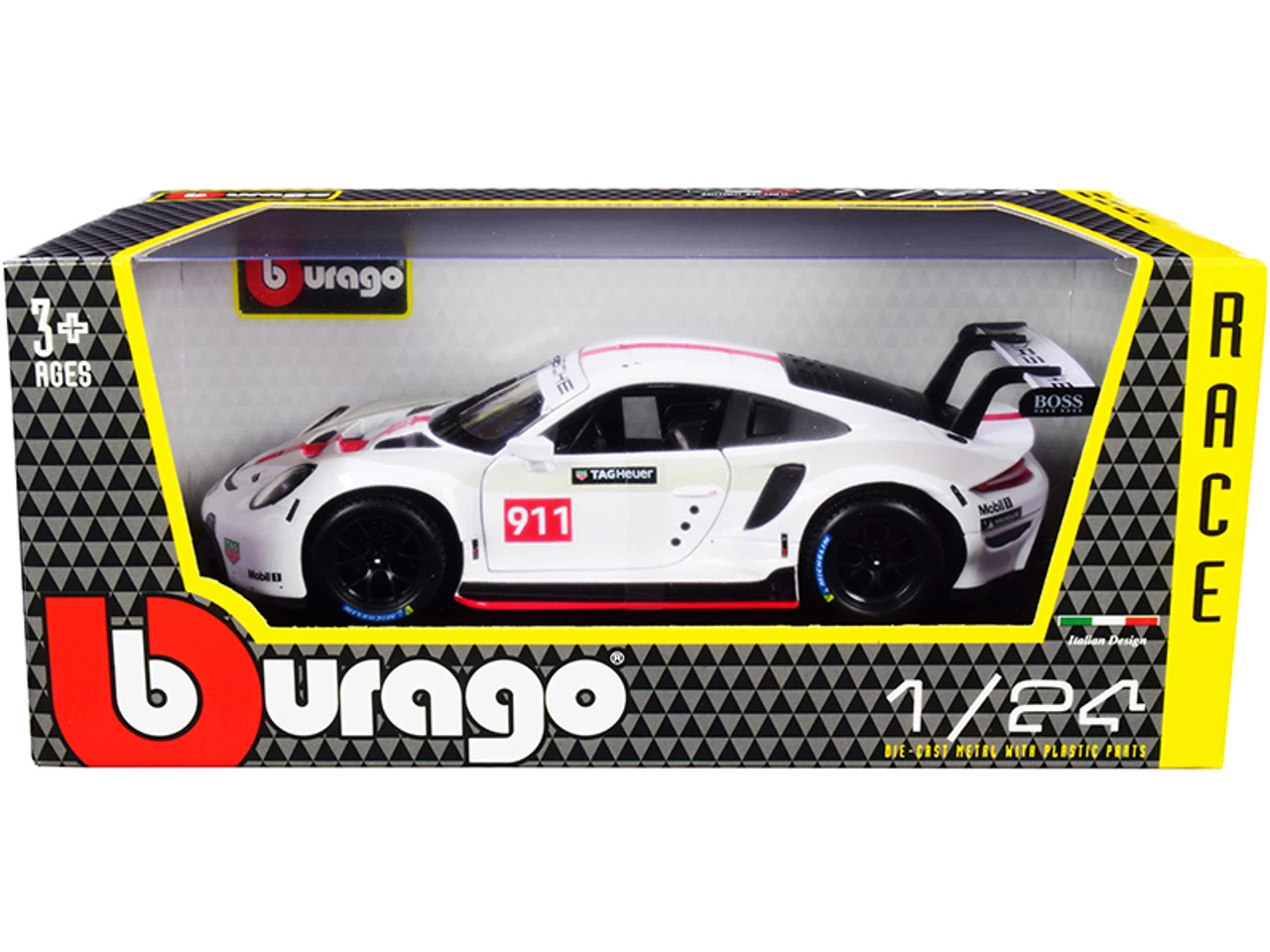 - Brand new 1/24 scale diecast car model of Porsche 911 RSR GT #911 White “Race” Series die cast model car by Bburago.